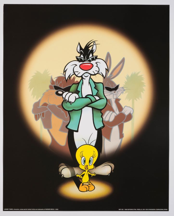 A limited edition poster from the Warner Bros. Studios. Featuring an illustration of Bugs Bunny, Sylvester and Taz looming behind Tweety bird in dark sunglasses, the poster was printed in an edition of 1000 in Spain in 2000. Measuring 19.5"x15.75" overall, the poster is in very good condition with minor edge and general handling wear. Ships rolled.